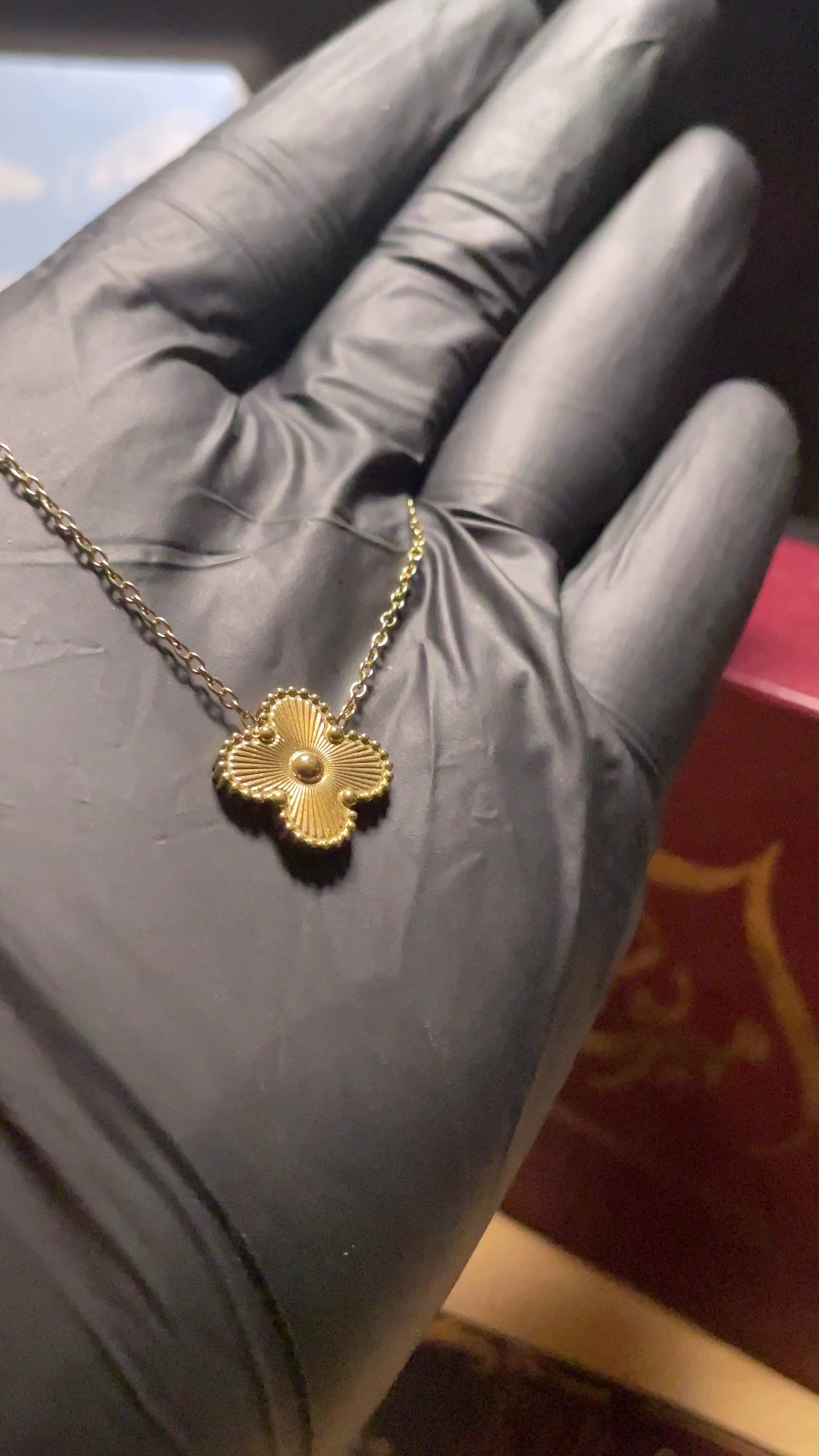 Embrace effortless elegance with this stunning Clover Pendant Necklace. Featuring a chic, four-leaf clover design with a captivating mother of pearl inlay, this piece adds a touch of timeless sophistication to any outfit. The pendant hangs delicately from a beautiful fine-link golden chain with subtle, sparkling accents.