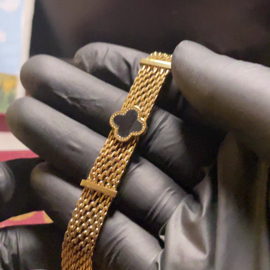 Elevate your look with this stunning Stainless Steel Clover Mesh Bracelet. Featuring a beautiful, intricate gold-toned mesh band, this piece offers a sophisticated, classic watch-band style with a modern twist. The focal point is a chic, squared charm with a black four-leaf clover motif, reminiscent of high-end luxury jewelry designs.