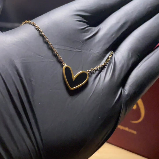 This delicate piece features a beautifully polished black heart charm, often associated with sophistication and modern style. The charm hangs gracefully from a shimmering, thin gold tone chain with subtle bead accents, adding just the right amount of sparkle to your neckline.