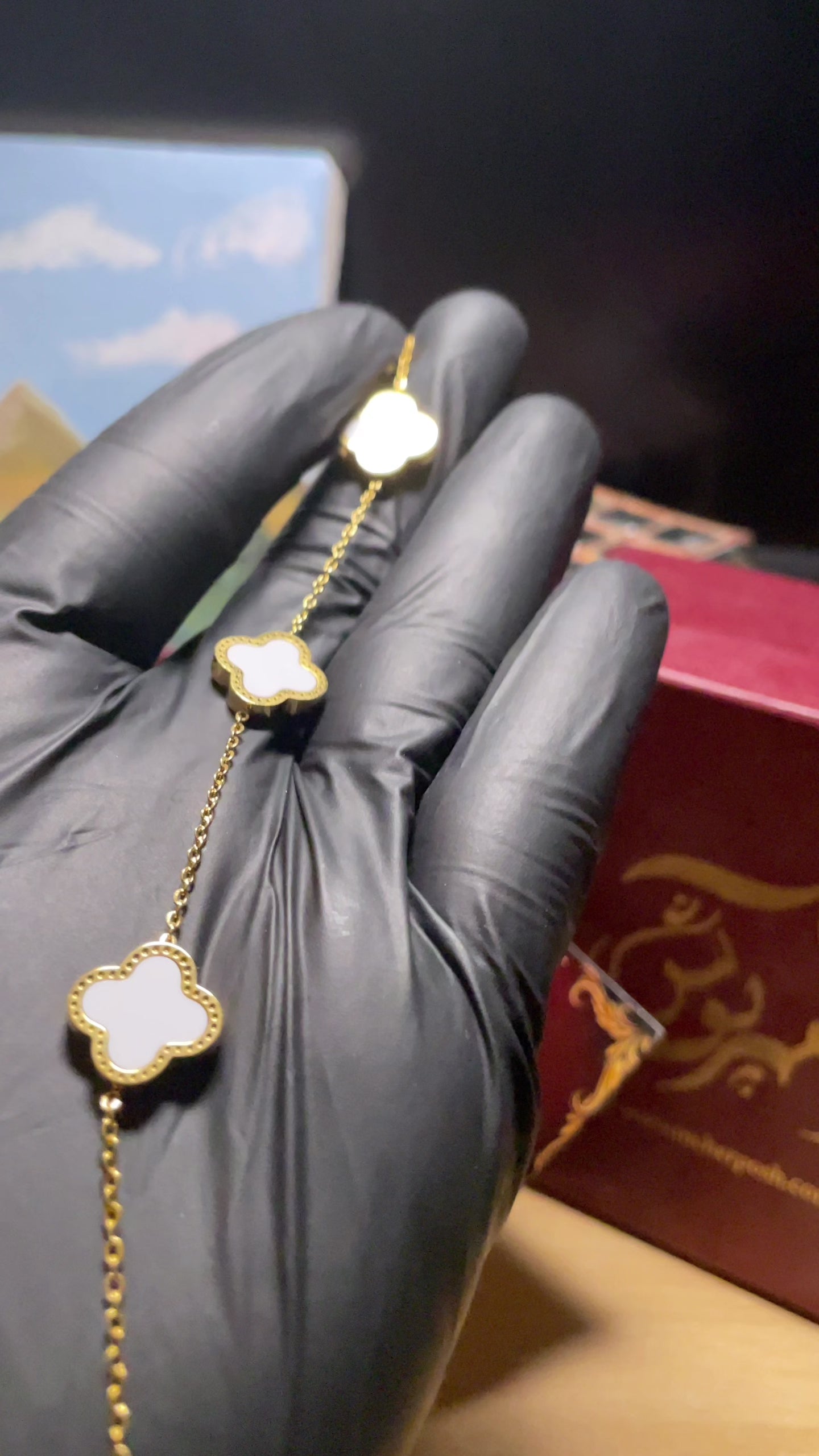 The bracelet features multiple beautiful clover-shaped charms crafted from a luminous, mother of pearl-like material, set in a durable and radiant gold tone stainlessĀ steel chain. The adjustable slider clasp ensures a perfect, comfortable fit for all wrist sizes and includes a charming hanging clover detail for an extra touch of grace.
