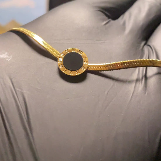 Elevate any look with our stunning Serpent Chain Choker, a piece that effortlessly blends classic elegance with modern flair. This necklace features a smooth, liquid-like herringbone chain that drapes beautifully against the skin, giving the appearance of a solid gold piece. At its center, a striking circular black enamel pendant is framed by a delicate halo of brilliant cubic zirconia stones, providing a rich, sophisticated contrast.